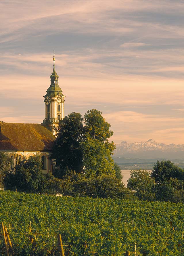 Weithin grüßt der 51 Meter hohe schlanke Turm der Wallfahrtskirche Birnau über die Weinberge. Die bedeutendste Barockkirche am See ist ein vollendetes Werk aus einem Guss, 1746 – 1750 erbaut von dem Vorarlberger Peter Thumb.